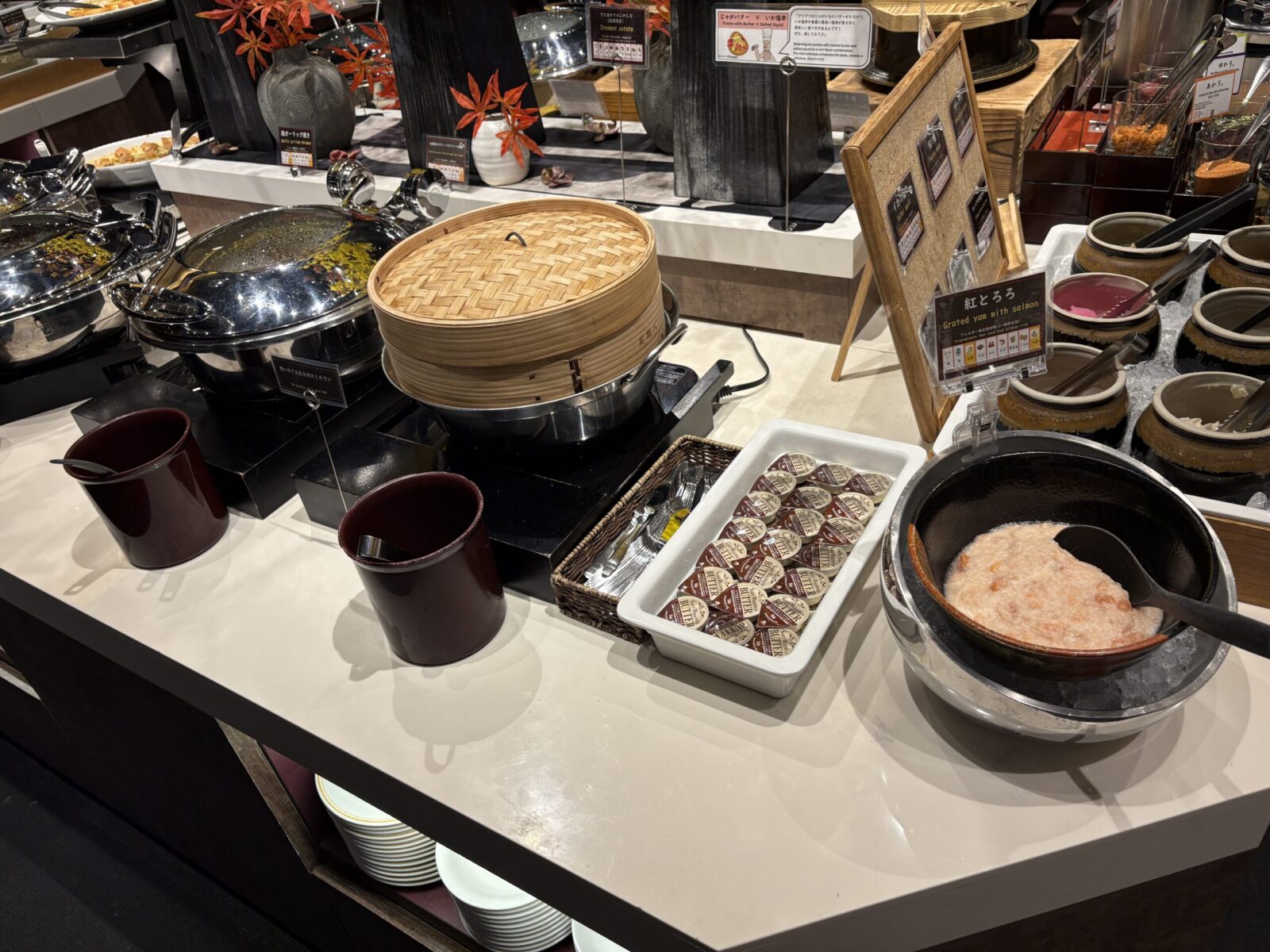 とろろに紅鮭が入っていて美味しかった。 御飯が進みます! 蒸篭の中は小籠包ではなくじゃがいもが入っています。