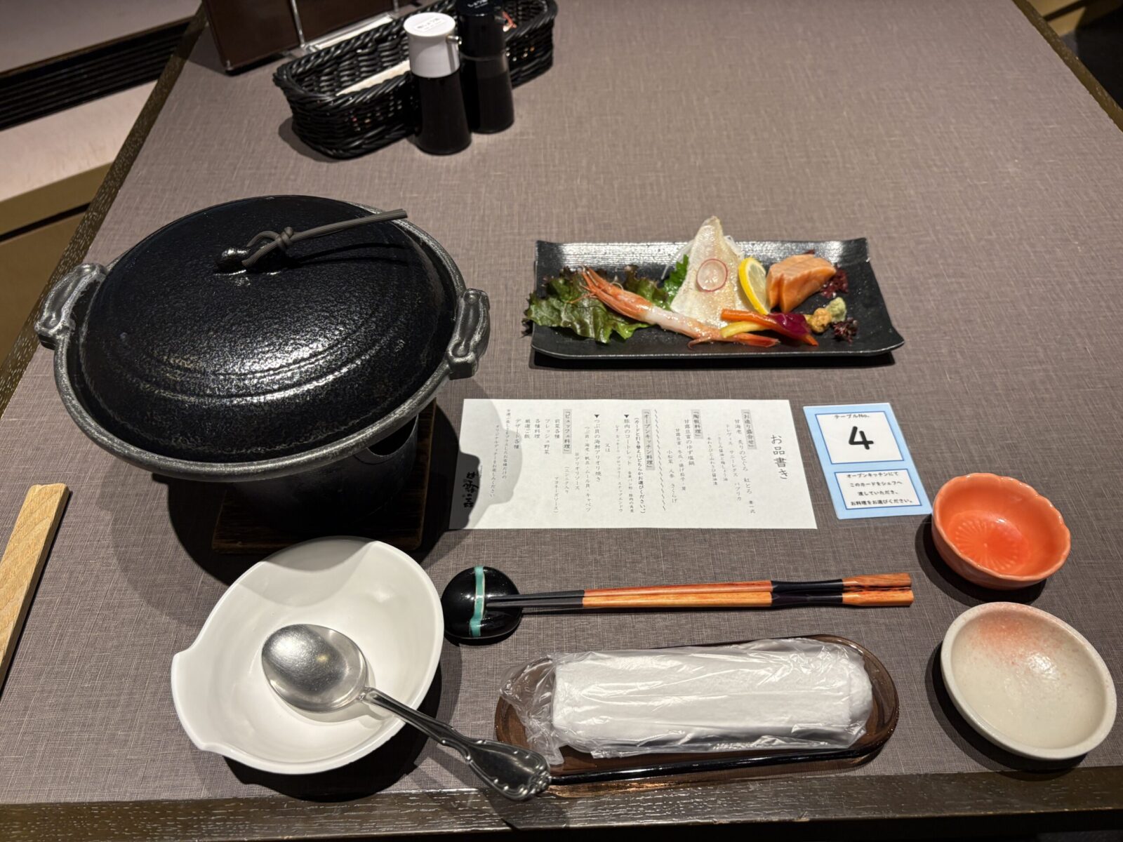 席に案内されるとスタートはこんな感じです。 今回はハーフビュッフェということでお造り、陶板料理のみが予めテーブルに用意されていました。
