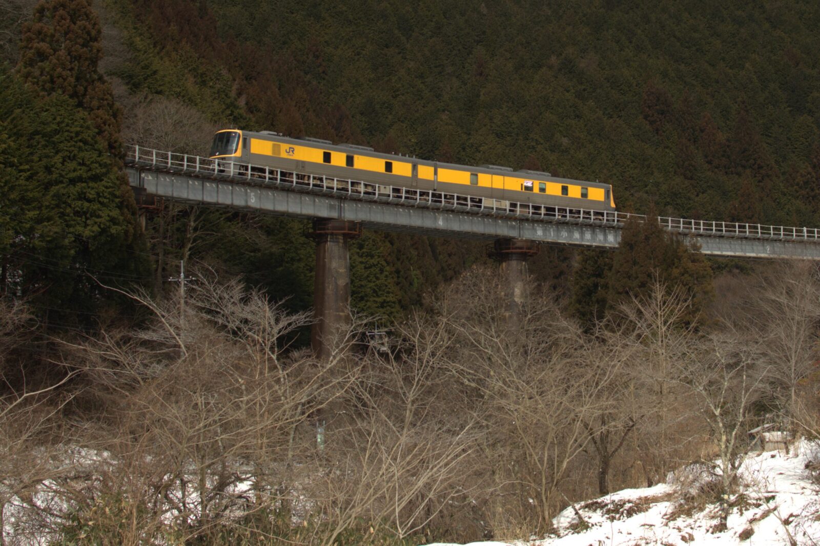 芸備線の新見口では有名撮影地の道後山の鉄橋です。 柵が高くて気になりますが有名撮影地ということでここに来ました。 芸備線は速度制限も多く追いかけも余裕でできるのですが、現地入りがギリギリでしたのでこの場所に直行でした。 カメラをセットして待つこと暫し、キヤ141第一編成が鉄橋上に姿を現しました。 もう少し雪があるかと思いましたが思いの外、雪が少なく物足らない結果に…