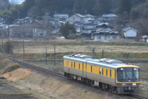 お手軽オーバークロスで撮影。 背後の集落を切るか迷いましたが敢えて集落をいれて撮影してみました。 東城より備後落合寄りは雪がそこそこあったものの東城より新見側はほとん雪はなく冬枯れのキヤ検となりました。