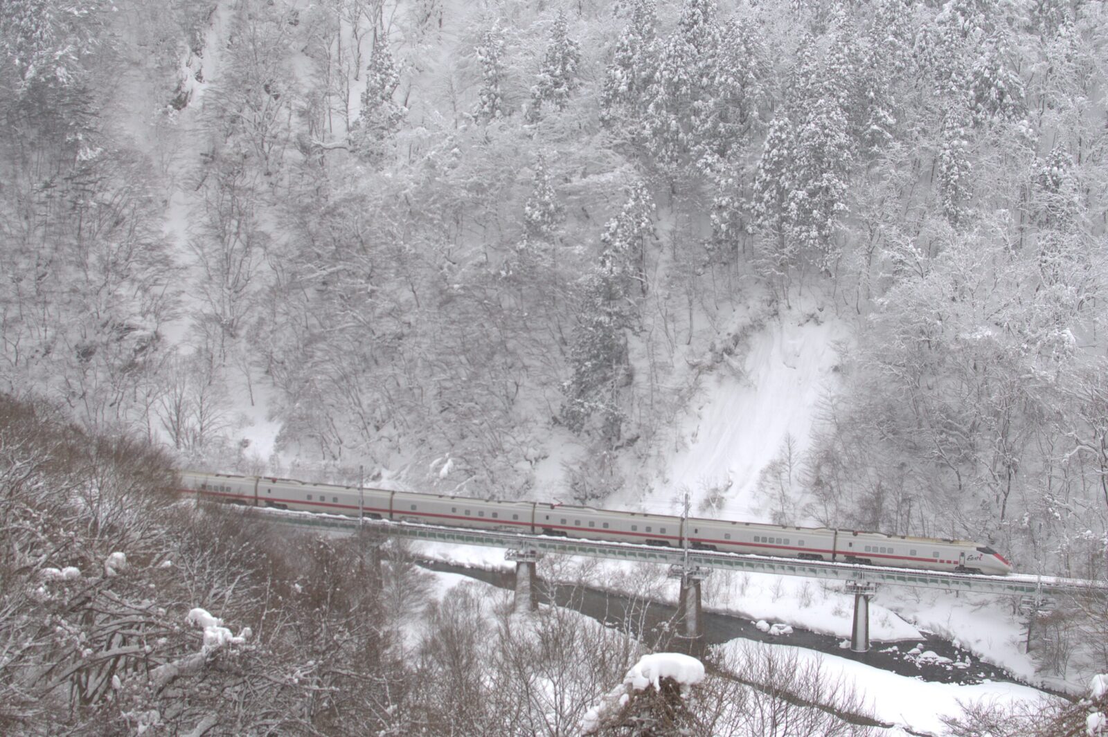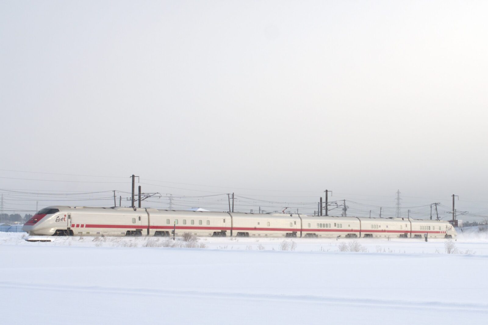 大雪で運転されるか心配でしたが定刻通りE926系East iが姿を見せてくれました。 側面に若干、陽が差し思ったよりもよいカットに仕上がりました。