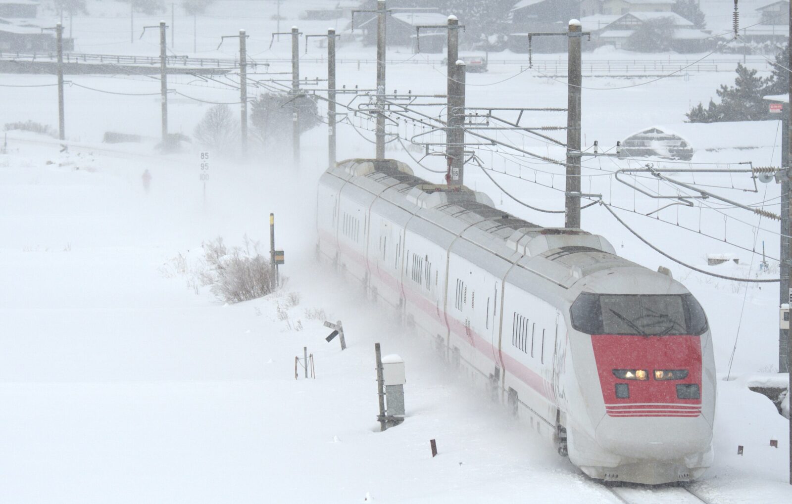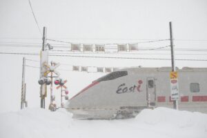 最後は吹雪いていて編成写真撮影しても綺麗に撮影できない可能性大だったので踏切を渡るE926系を撮影することにしました。 この踏切E3系スタイルだから収まりがよいですがE6のロングノーズだと結構微かも…