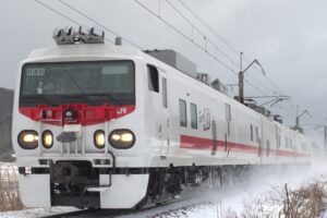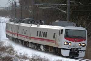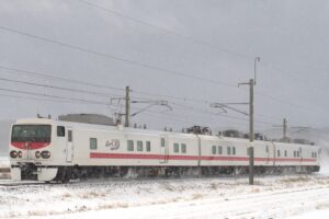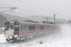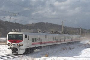 和田でこまち7号と交換してきたこまち18号を同じ踏切から撮影しましたが鼻の上には大量の雪が乗っていました。