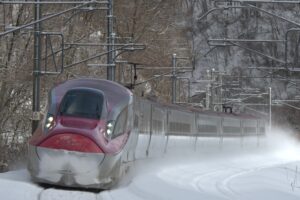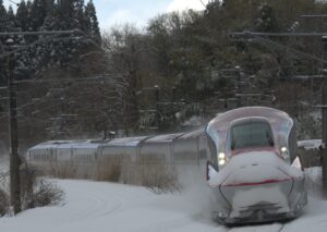 和田でこまち7号と交換してきたこまち18号を同じ踏切から撮影しましたが鼻の上には大量の雪が乗っていました。