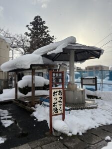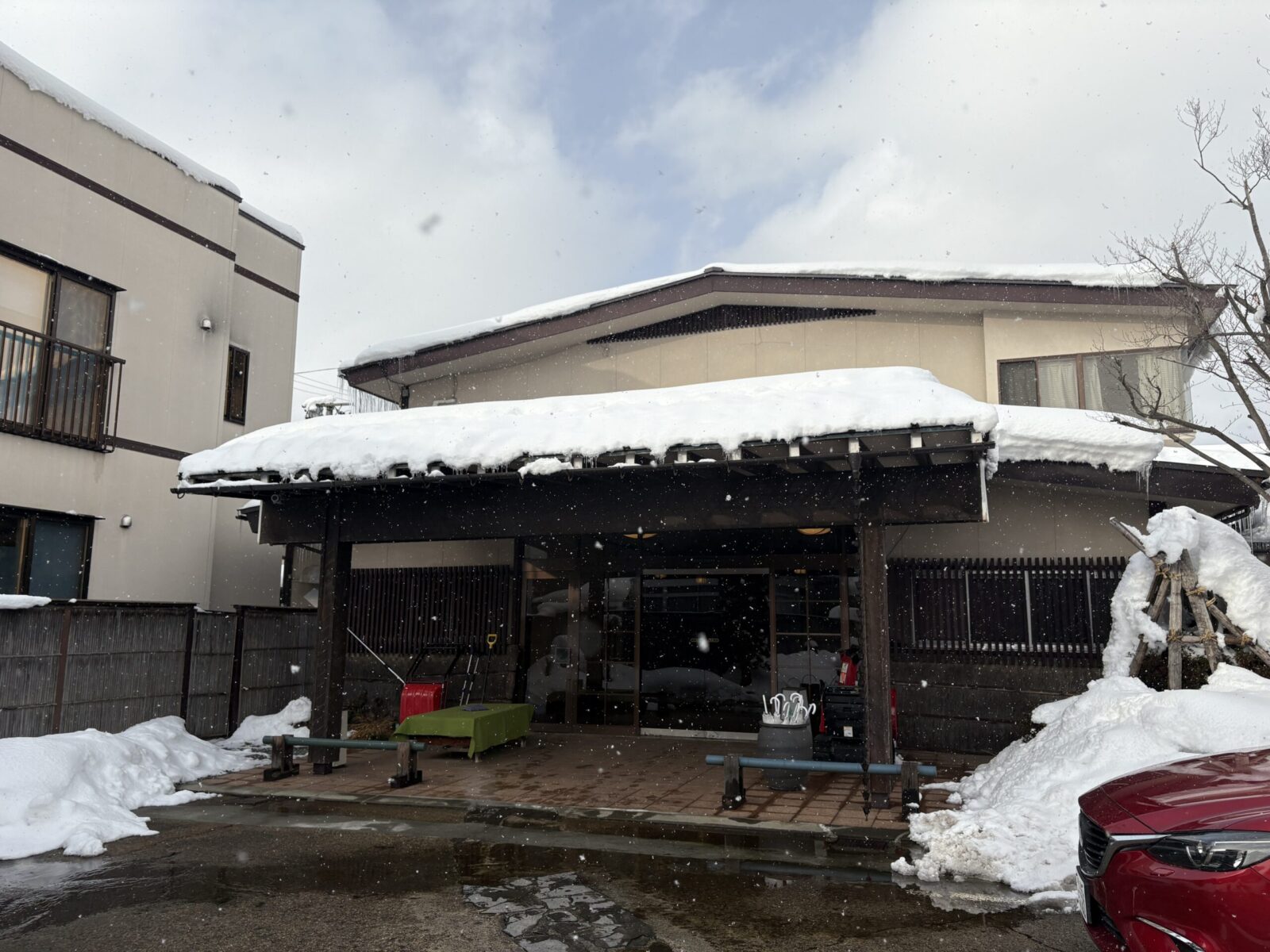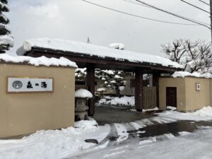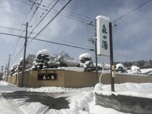 大雪ですが時折晴れ間から太陽が顔をのぞかせるなか森の湯に到着。