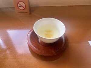 ロビーで宿帳を記入する際に提供された温かい柚子ドリンク、柚子の香りと程よい甘さで美味しかったです。