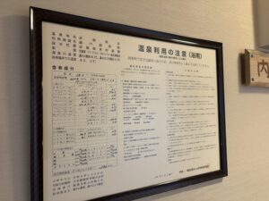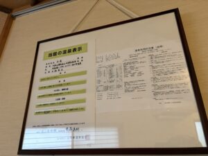 成分的にはナトリウム529mg、塩素イオン970mg、硫化水素イオン2.5mg、遊離硫化水素0.8mg、メタケイ酸は50mgと成分表を見る限りは特筆すべき特徴はなく軽い塩化物泉かつ少し硫黄が入ってるくらいかなぁといった感じ。 泉温は58.3℃ pH7.6なのでほぼ中性に近いお湯です。 泉質的には含硫黄-ナトリウム・カルシウム-塩化物温泉(低張性中性高温泉)となります。 成分的には濃すぎずかと言って単純泉ほど薄くもなく入りやすそうなお湯です。