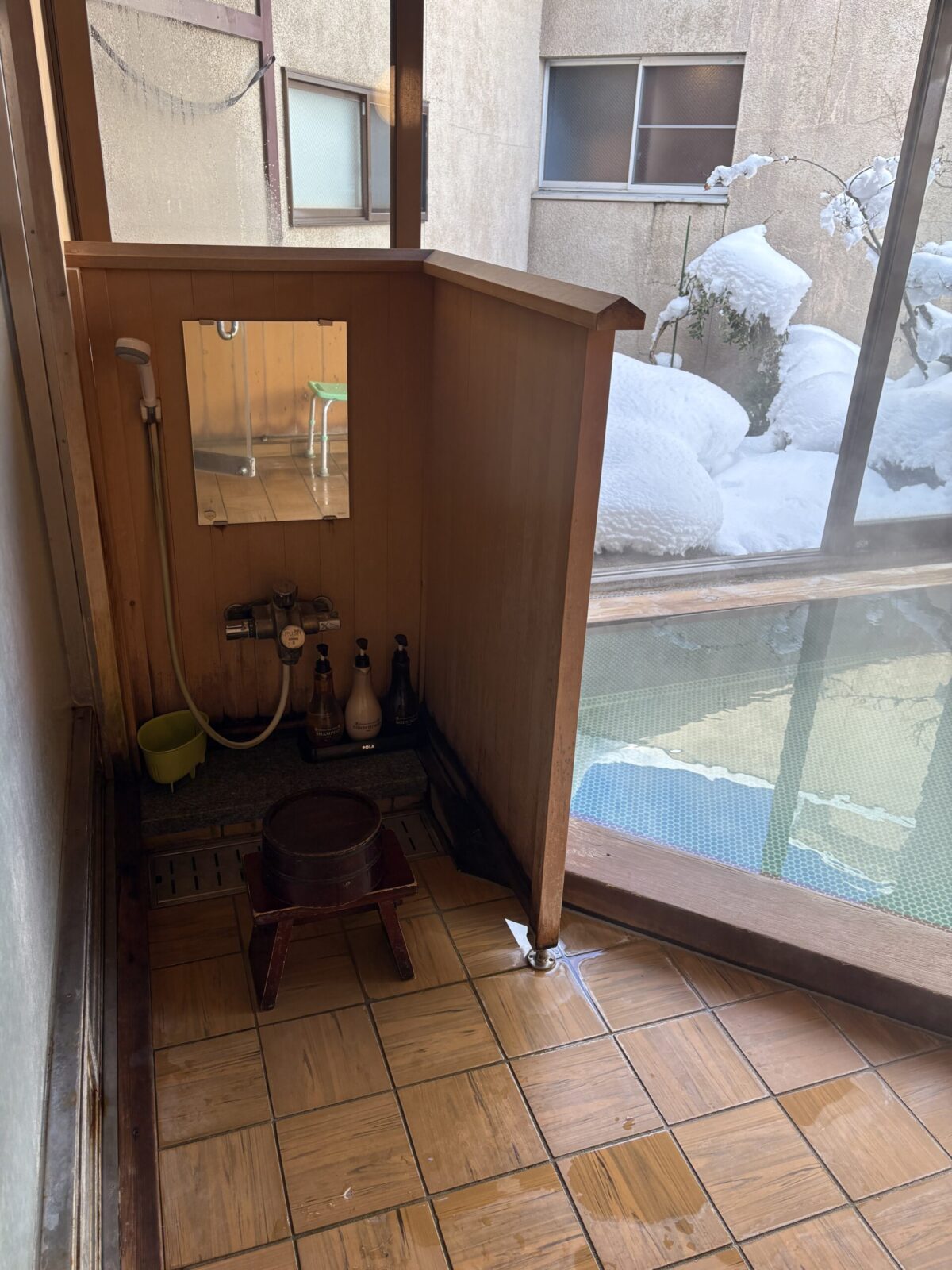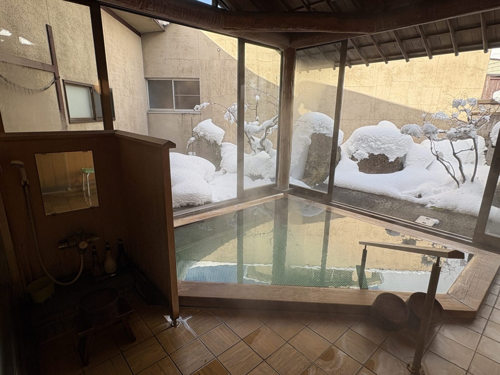 三角形の湯舟が一つ。 赤湯温泉自体は住宅街の中に宿が点在している状態なので露天風呂とは言えお風呂も壁に囲まれていて解放感はありませんが御覧の通りの大雪の中入る雪見風呂は最高です。