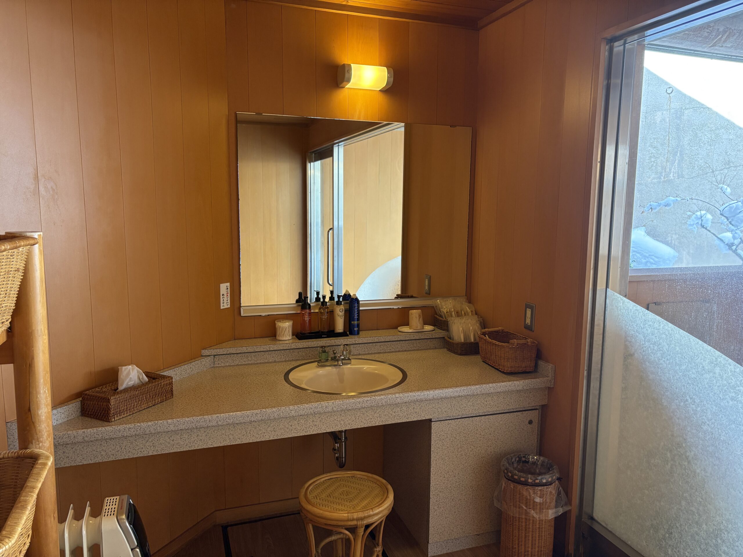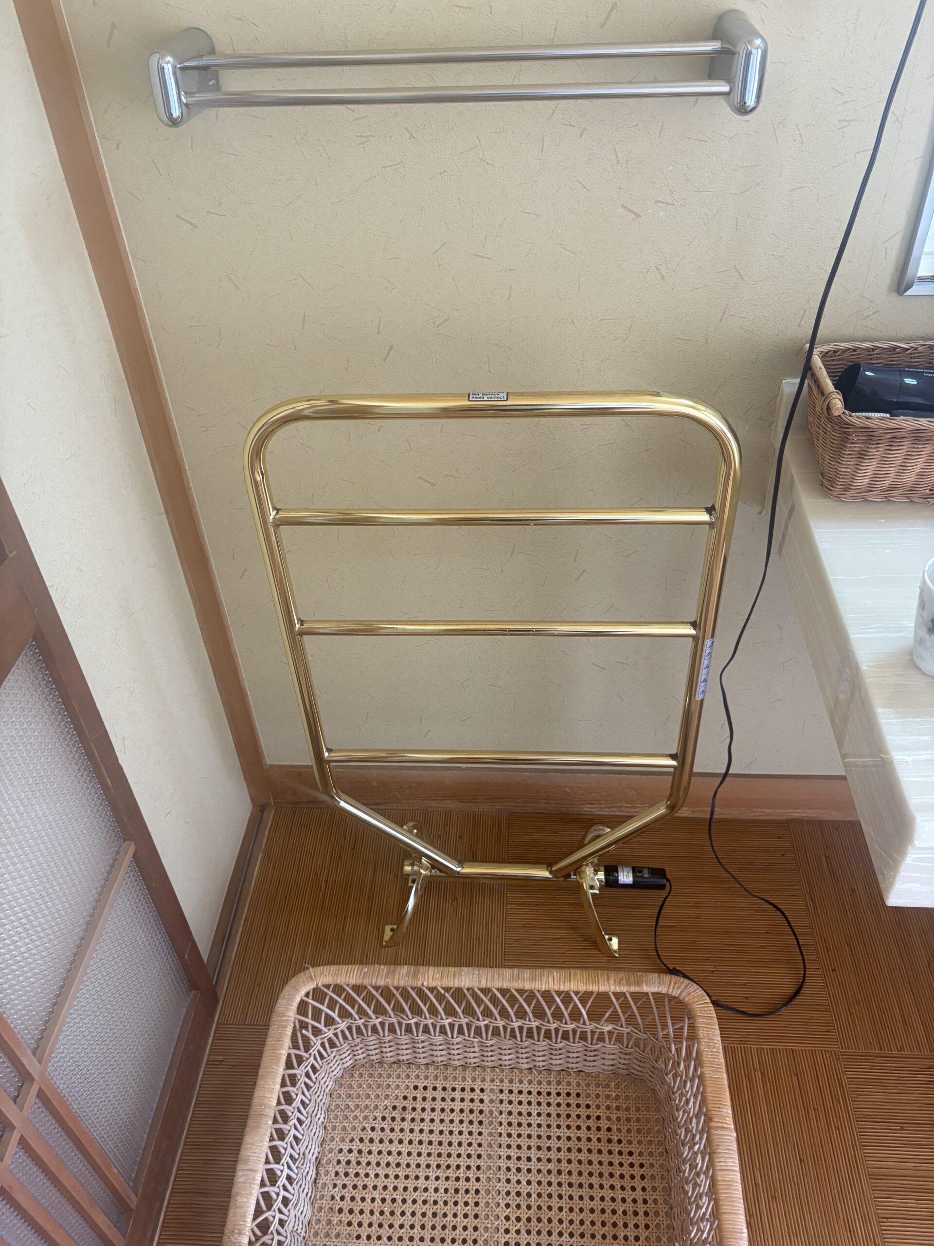 今回は使いませんでしたが部屋のお風呂もお湯は温泉が出てきます。 素晴らしい!! 洗面台にはタオルウォーマーが用意されていました。 これはありがたい。