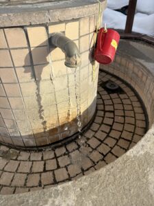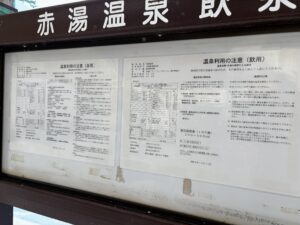 試しに一口飲んでみましたが結構な硫黄の香りとわずかな塩味が感じられました。 浴用のお湯より濃い感じがします。 適応症は糖尿病や高脂血症。便秘等…
