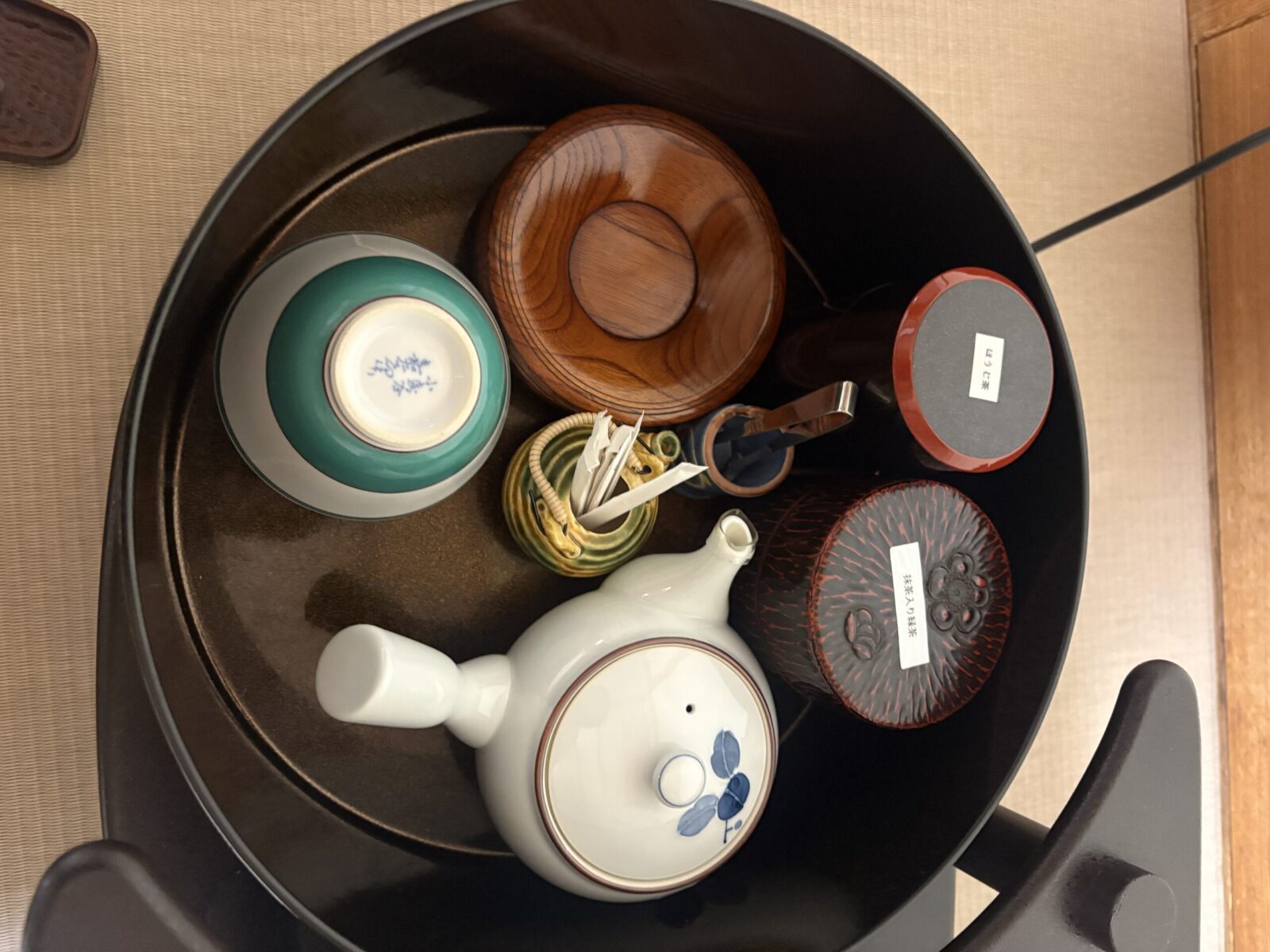 お茶は抹茶でも粉のインスタントでもなく急須でセルフで注ぐタイプでした。 窓際のテーブルには冷たい水も用意されていました。