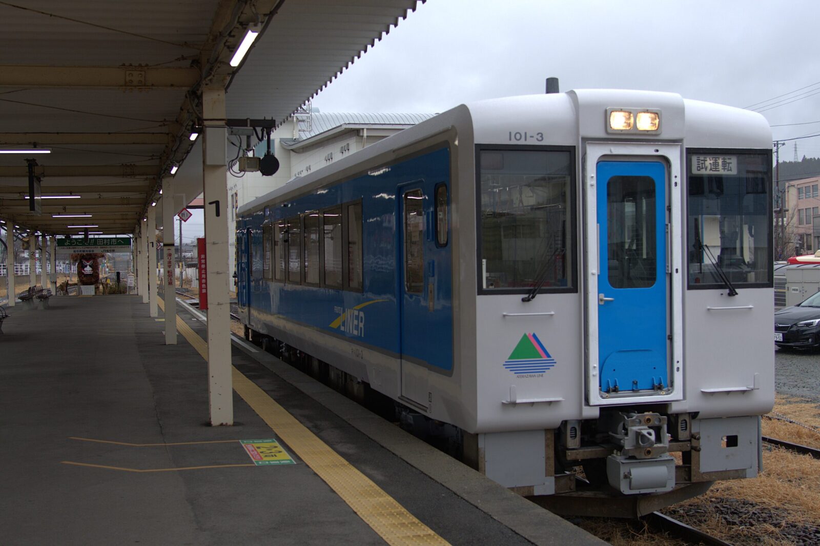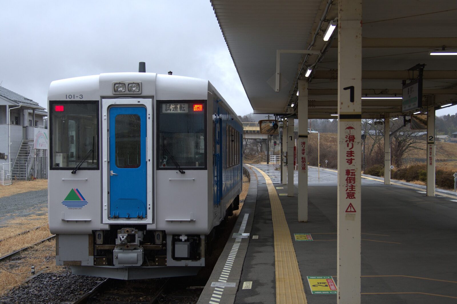 以前から撮影したいと思っていた磐越東線 郡山~船引間で実施される左沢線用キハ101の郡山工場出場試運転ですが、ようやく運転日と休みが重なってくれたために悪天候ながらも撮影してきました。 とういうわけで久々に磐越東線沿線に向かいます。 磐越東線で撮り鉄するのは久留里線の国鉄色キハ30の試運転以来なので10年以上ご無沙汰です。 磐越東線に行く前に郡山の車両センターに立ち寄ってみると奥の方でライトを点灯させたキハ101-3が発車準備をしているところでしたので、運転があることを確信して三春~要田のオーバークロスへ車を走らせます。