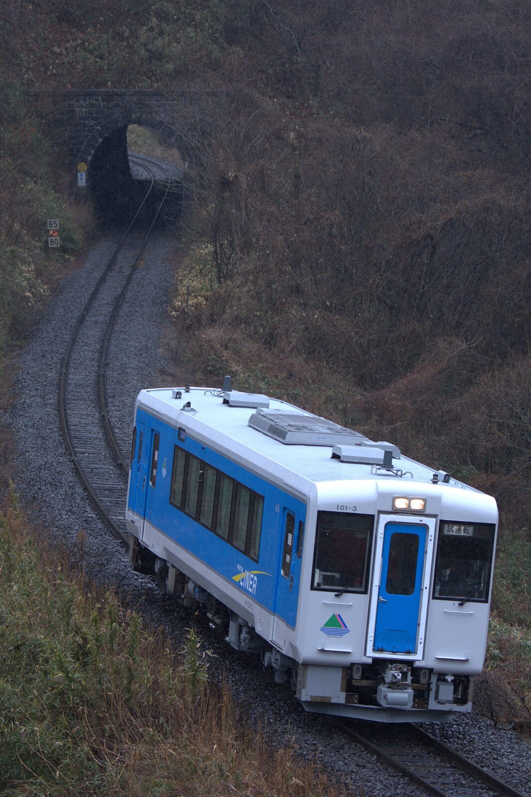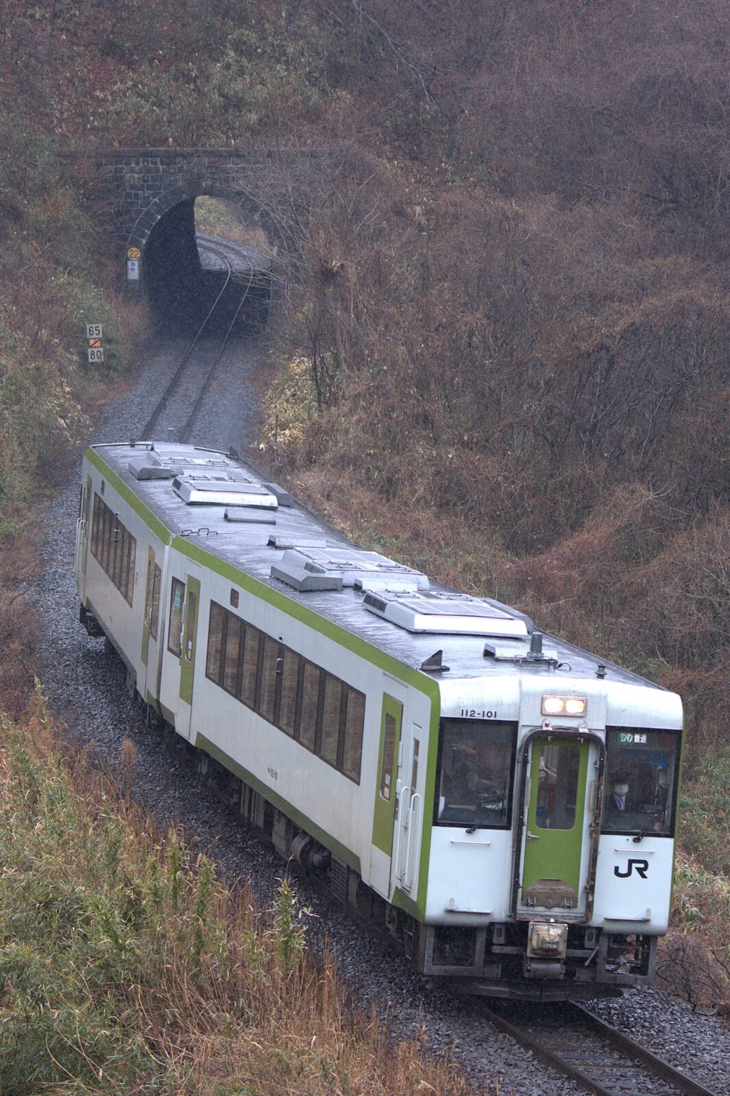 トンネルの奥のレールが一瞬光るとキハ101-3が姿を現しました。 磐越東線が一瞬だけ左沢線と化した瞬間です。