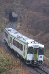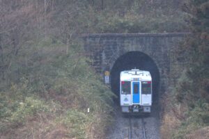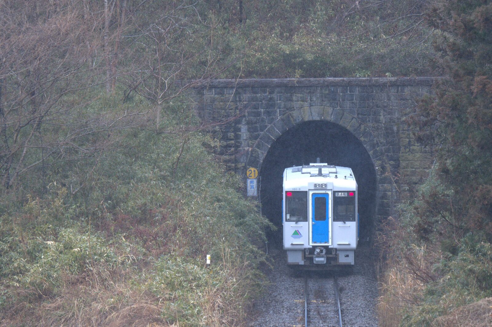 振り返りトンネルへと吸い込まれるキハ101-3を撮影。 左沢線内では基本2連~6連で運用されているので単行でキハ101が撮影できるのも出場試運転ならではです。