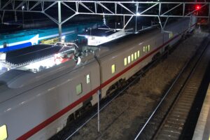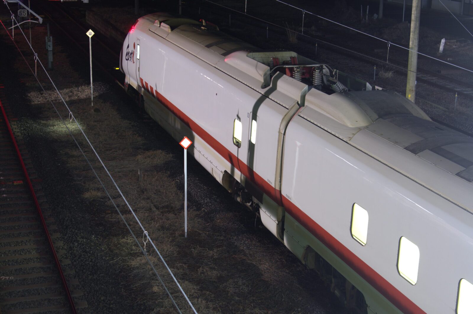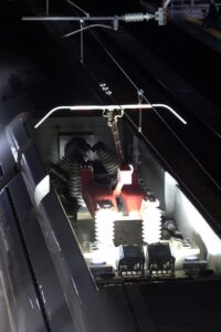 跨線橋の下あたりに検測パンタのある車両が停車していたので検測ライトに照らされライトアップされているパンタグラフをバルブ撮影してみました。 ライトアップされたパンタを綺麗に撮影できることは難しいのでこれが撮影できたことが庭坂駅での一番の収穫かも…