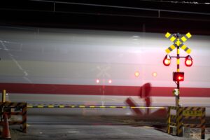 シャッタースピードを6秒に設定したところ通過速度が速すぎて車両に後ろ側の踏切警報機が透けて見えてしまいました… 2秒くらいで適正な明るさになるように設定するのが正解だったようです…